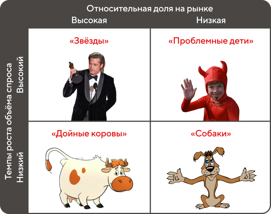 В матрице продукты разделяются на типы: «дойные коровы», «собаки», «звёзды» и «проблемные дети».