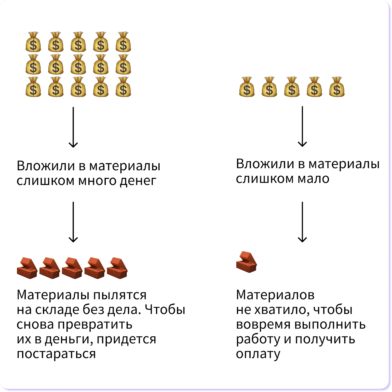 Оборотный капитал позволяет компании жить и работать. И задача предпринимателя — сделать так, чтобы оборотки хватало на всё, что нужно, но не больше. Если оборотки слишком много, деньги замораживаются в сырье, запасах, а если мало — их не хватает на производство, оказание услуг и жизнь бизнеса.