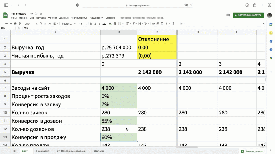 Начнем с заходов на сайт. Увеличим их с 4000 до 5000 — вполне реальная цель — и посмотрим, как изменятся выручка и прибыль: