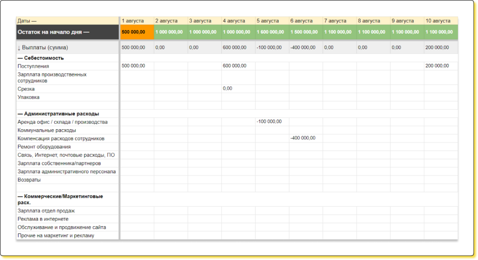 ↑ В первой колонке платежного календаря выбирают статью поступления или выбытия, после чего вносят сумму в колонку с датой