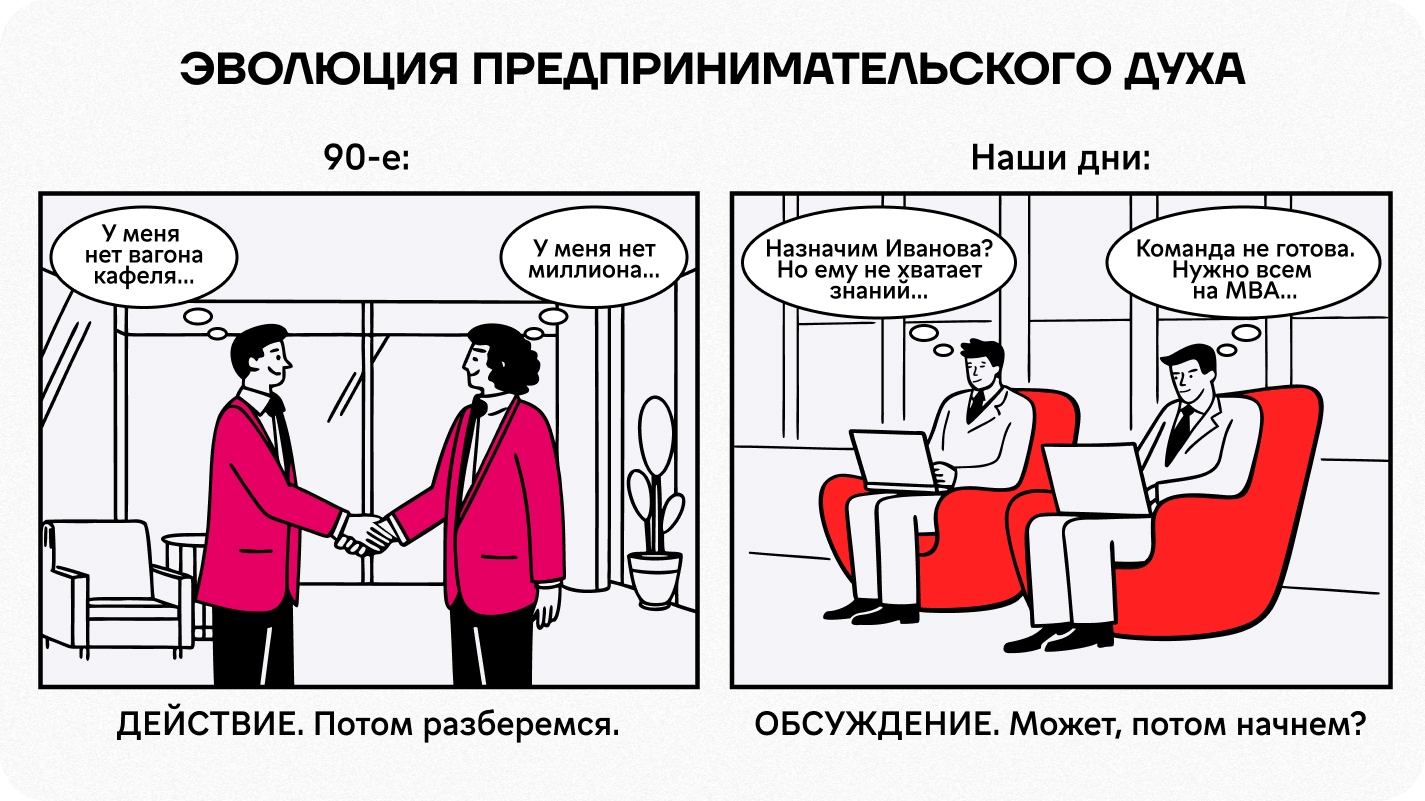 В компаниях разворачиваются дискуссии: «Иванову не хватает компетенций, отправим на обучение», «Команда не готова, нужно прослушать курс по Agile». Время уходит на аналитику, планирование и шлифовку методик. А основатель смотрит на этот процесс и задается вопросом — не закроется ли окно рыночных возможностей, пока команда готовится к старту?