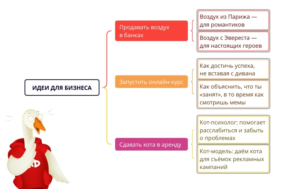 И сразу дадим пример ментальной карты от нашего отважного предпринимателя — Гусика, который всё время ищет идеи для нового бизнеса. Смотрите, как он структурировал свои мысли ↓