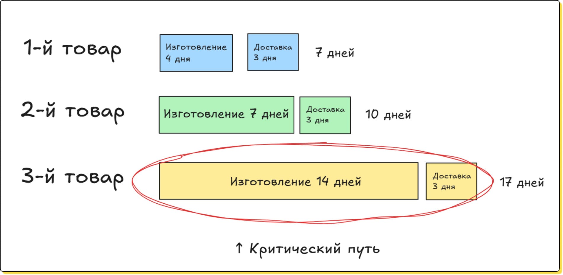 Например, если заводу нужно изготовить и отгрузить три разные детали за 20 дней, то время на изготовление и доставку самой сложной детали и будет критическим путем ↓