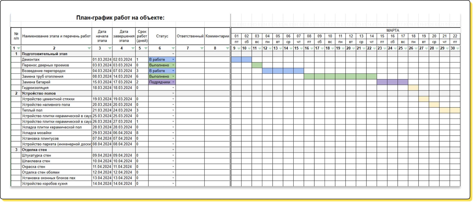 Шаг 2. Разбить этапы проекта на задачи. Это поможет определить необходимые ресурсы в виде времени, людей и техники, которые понадобятся для выполнения проекта. Например, этап подготовительных работ на участке под строительство может состоять из таких задач.