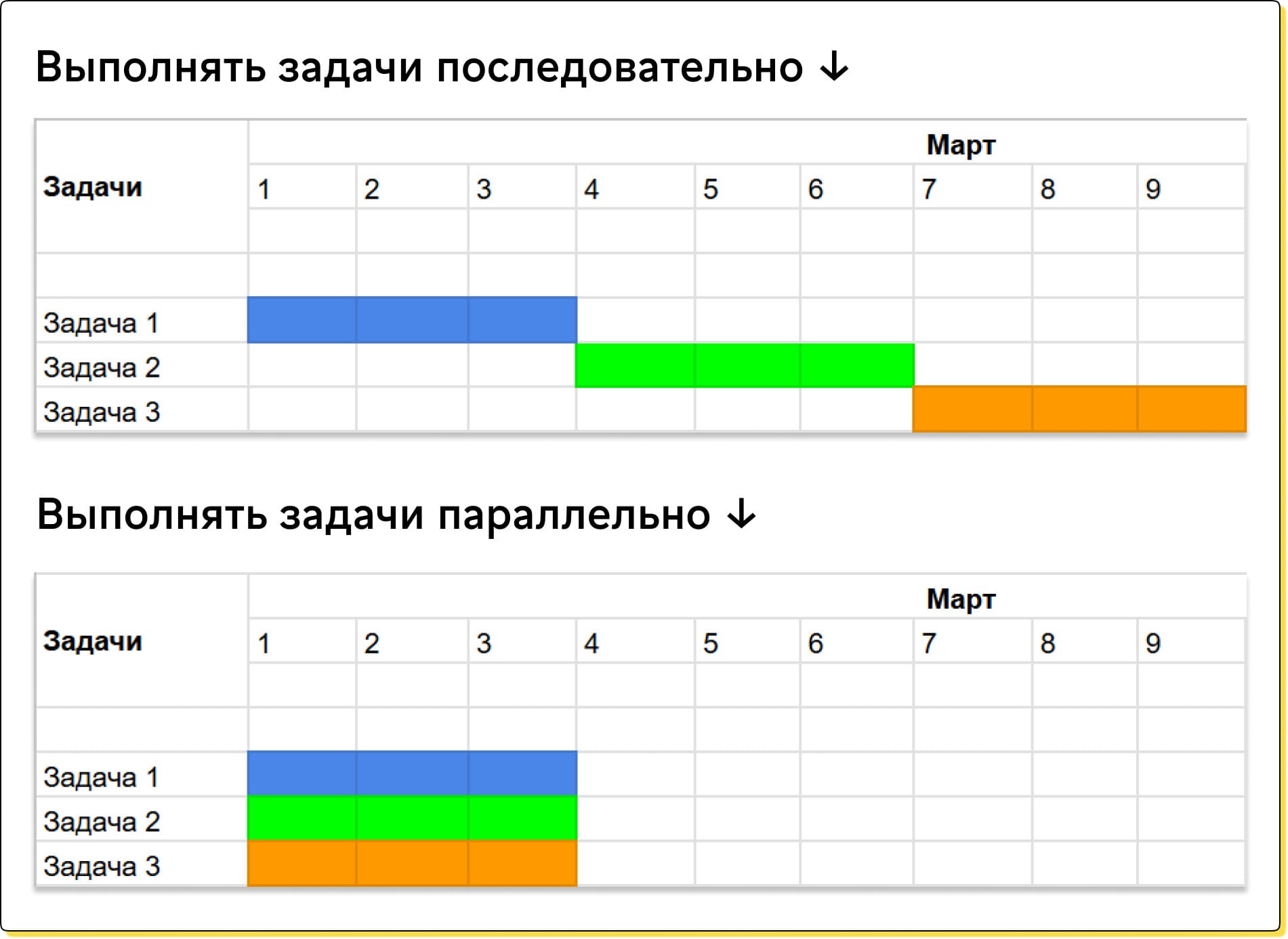 → Оптимизировать процессы — понять, какие задачи можно выполнять только последовательно, а какие можно делать параллельно. А еще продумать альтернативы: есть ли другой план, чтобы сдать проект вовремя, если что-то пойдет не так.