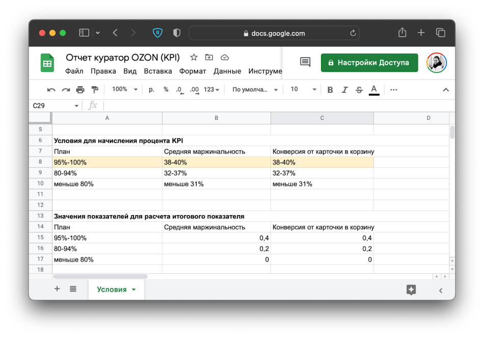 У кураторов «Озона» и «Вайлдберриз» все показатели также имеют свой вес — и чем лучше они выполняют свой план, тем больший вес будет иметь их показатель. В итоге доход складывается из оклада и процента от выручки со своей площадки. Но есть и ограничения: если личный план выполнен меньше, чем на 80%, бонус они не получат.