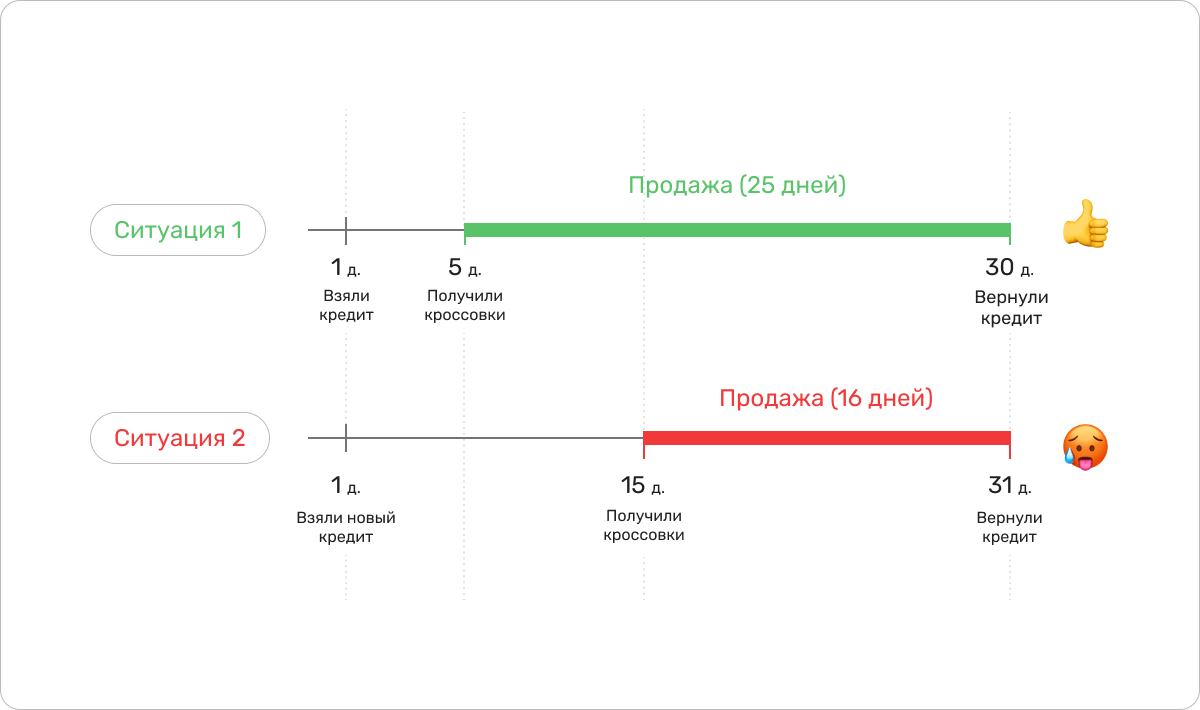 У дебиторской и кредиторской задолженностей есть периоды оборачиваемости. Например, «период оборачиваемости дебиторки 7 дней» значит, что ваш должник платит вам в течение 7 дней. Магия в том, что при определенном балансе дебиторки и кредиторки у вас с деньгами будет все хорошо.