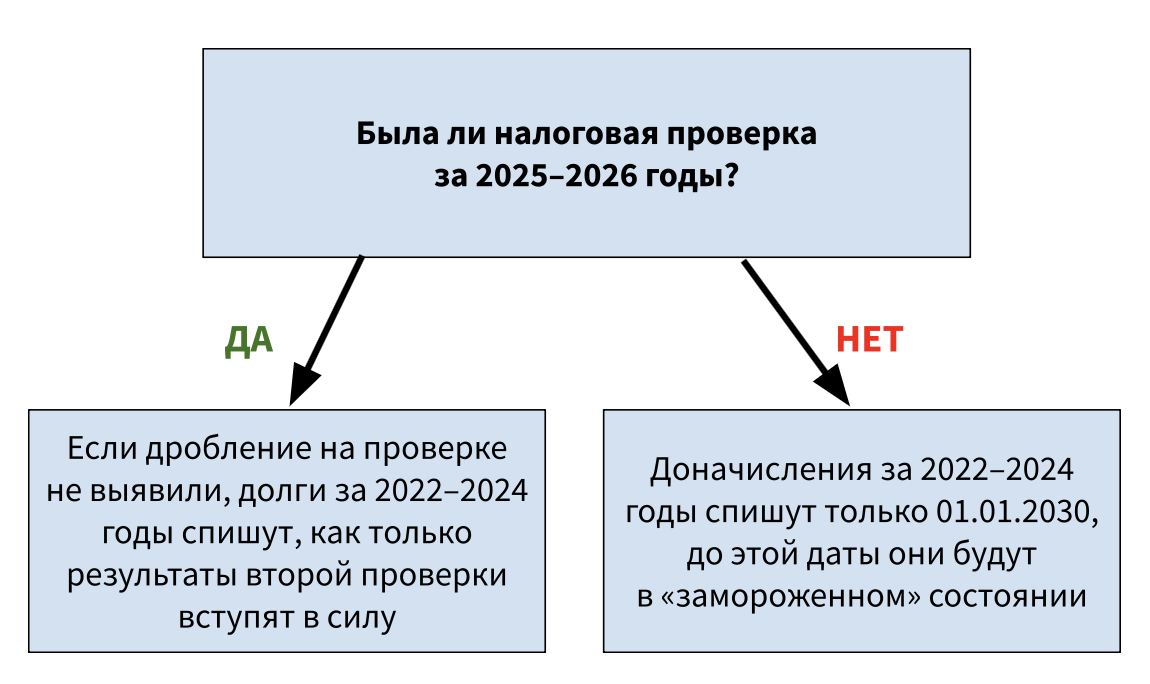 По амнистии доначисления за 2022–2024 годы отменят тогда, когда в силу вступят результаты налоговой проверки за 2025–2026 год. Если же проверка так и не состоится, долги спишут автоматически 1 января 2030 года. А до этого времени задолженность будет заморожена, что позволит предпринимателям планировать свои финансовые потоки без угрозы внезапных взысканий.