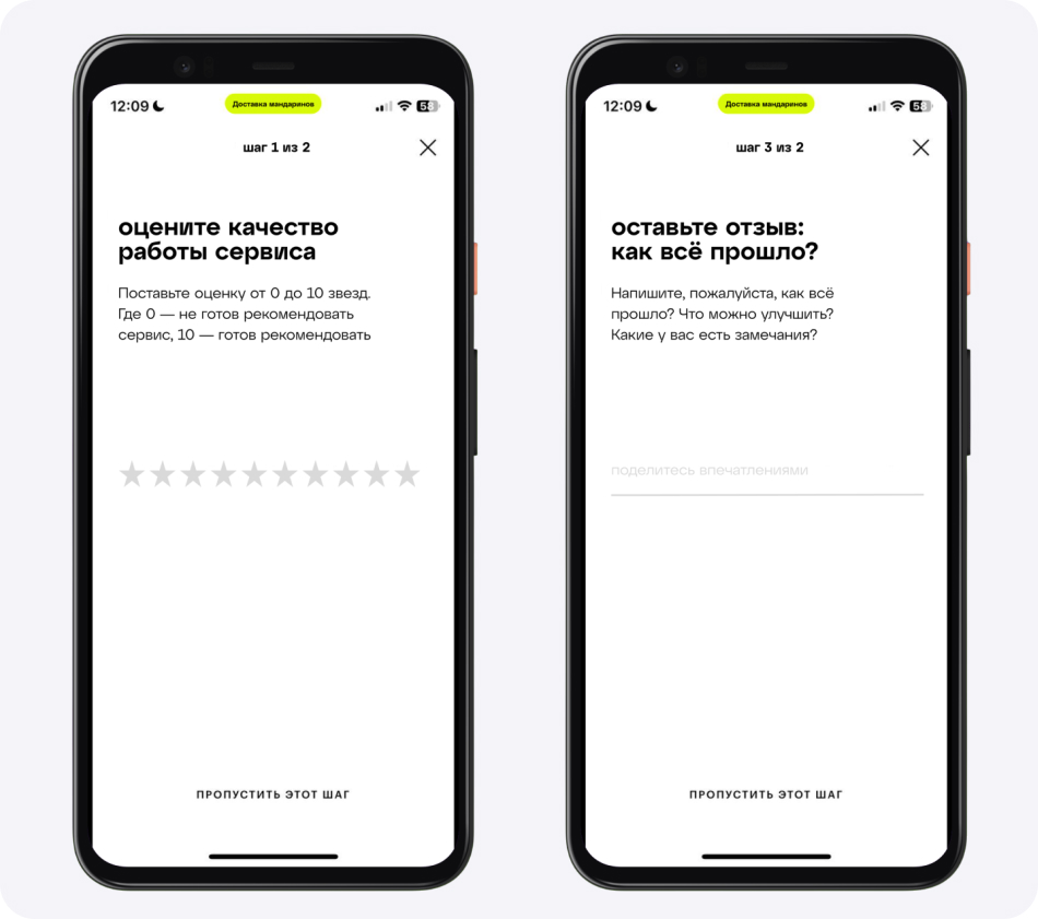 Для сбора ответов в приложении подойдет всплывающее окно или отдельный экран с оценкой работы сервиса, магазина, качества продукции или доставки. Оценку можно дополнить просьбой оставить отзыв