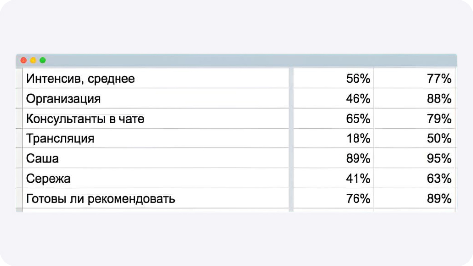 Когда мы увидели 18% по пункту «Трансляция», начали вместе с операторами думать, что было не так и как можно улучшить. Поработали, и в итоге оценка трансляции поднялась с 18 до 50%, а NPS — с 76 до 89%.