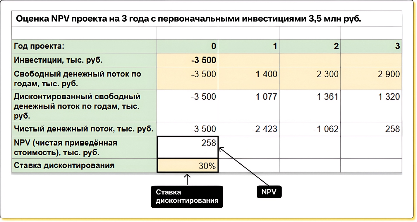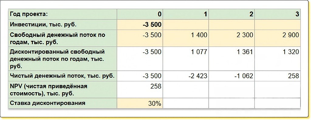 NPV = (1,4 млн ₽ / 1 + 30%)1) + (2, 3 млн ₽ / 1 + 30%)2) + (2,9 млн ₽ / 1 + 30%)3) - 3,5 млн ₽ = 257 852 ₽