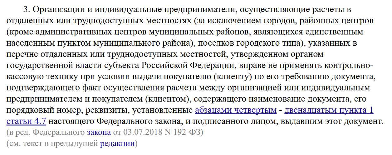 ФЗ 54. Ст.2 Кассу можно не применять в местностях, которые официально входят в перечень труднодоступных в РФ