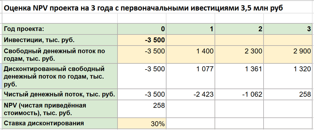 Шаг 3. Рассчитайте денежные потоки — учтите все поступления и выплаты. Разделите на операционные (выручка минус зарплаты, налоги) и инвестиционные (закупка техники). Например, для магазина: в первый год инвестиции — 5 млн рублей, операционный поток — 500 тыс./мес.