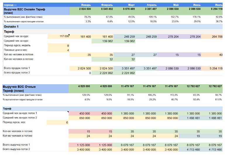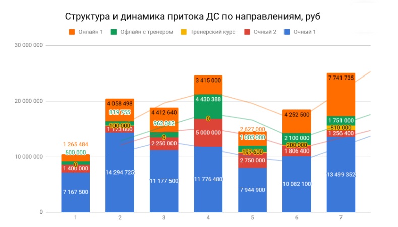 ДДС полностью детализирован по направлениям и продуктам. Собственник видит вклад B2C онлайн, B2C офлайн, B2B и каждого продукта в отдельности.