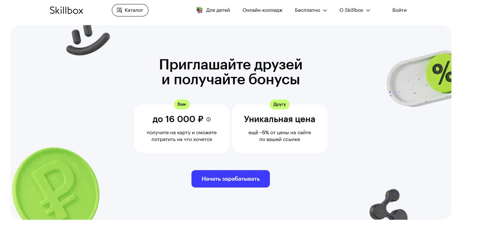 Тот же принцип (RevShare) работает в Skillbox. Российская платформа платит любому партнеру — будь то обычный пользователь с реферальной ссылкой в соцсети или крупный блогер — процент с продаж привлеченных на курсы клиентов.