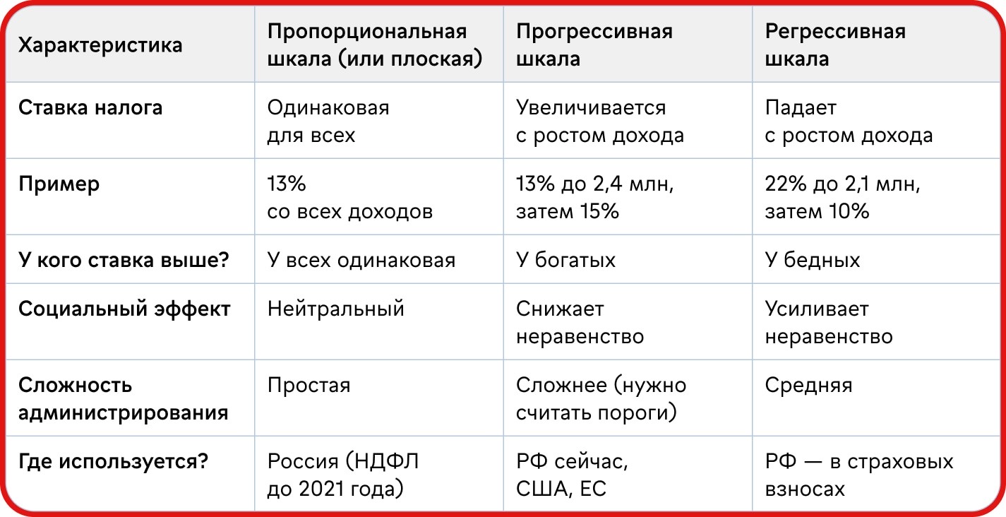 Для наглядности сравним три шкалы налогообложения в таблице: пропорциональную (почти то же самое, что плоская), прогрессивную и регрессивную ↓
