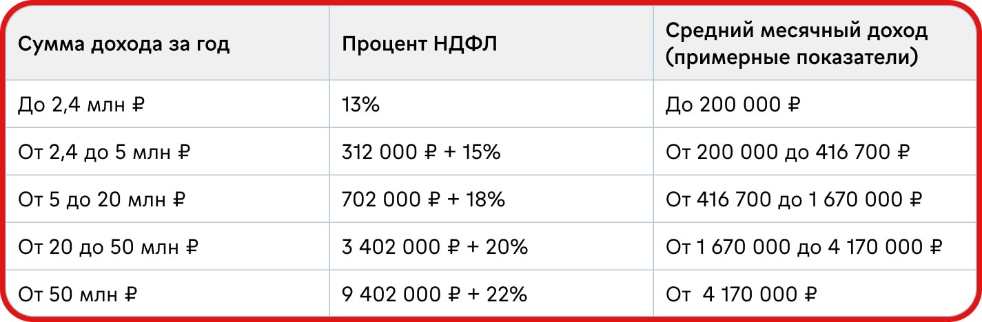 Пример: допустим, до 2,4 млн рублей — налог 13%, а всё, что сверху — уже 15%. Значит, 13% вы платите с первых 2,4 млн, а 15% — только с «лишнего».