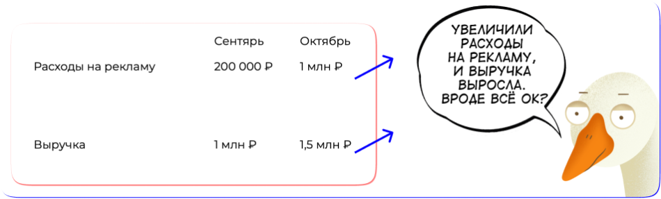 Представьте, что компания вложила в рекламу 1 млн ₽, получила 1,5 млн ₽ выручки, — это хороший результат? Или плохой? С виду хороший: