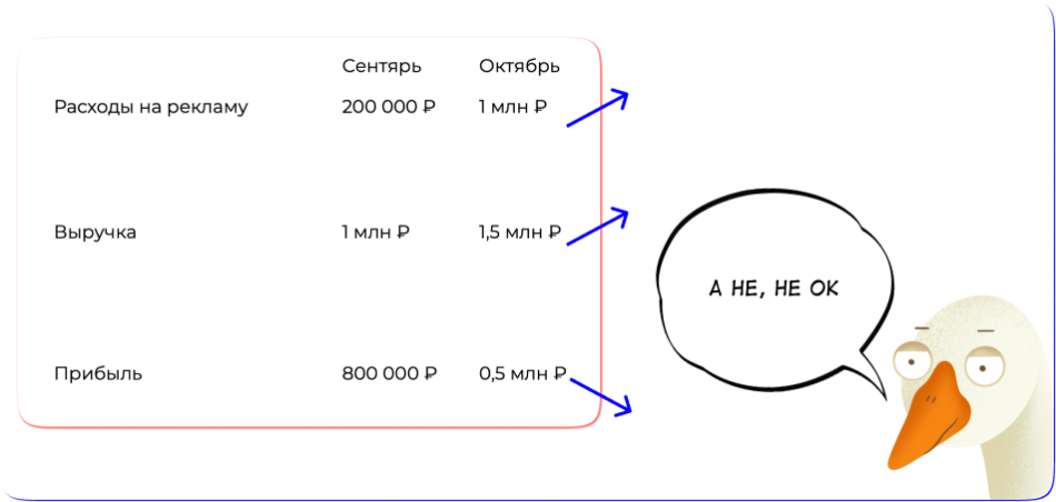 Но на самом деле — черт его знает. Надо еще смотреть, что там с прибылью. Бывает так: компания вложила 1 млн ₽, получила 1,5 млн ₽ выручки, а вот прибыль у нее упала. Потому что увеличились расходы на рекламу: