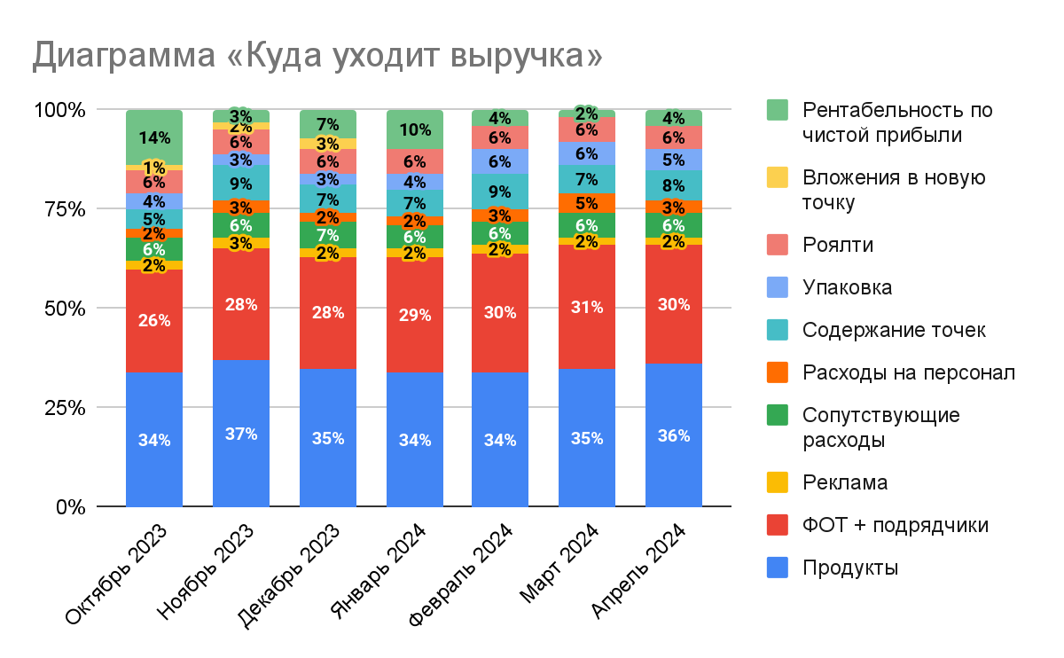 По графику видно, что спад начался с ноября — это как раз совпало с открытием новой, четвёртой точки. При этом в декабре и январе был небольшой рост за счёт праздничного сезона, но показатели всё равно не дотянули до уровня, который был до открытия новой точки — в октябре.