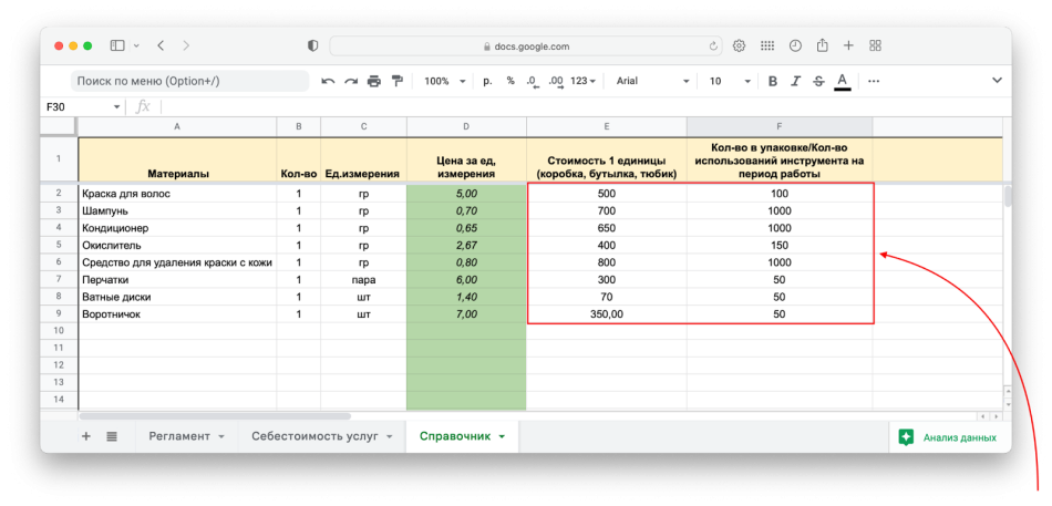 Дальше нужно посчитать, сколько материалов уходит на одну услугу. Например, для окрашивания нужно по 35 грамм краски и окислителя, по 70 грамм шампуня и кондиционера. Эти значения заносим в таблицу.