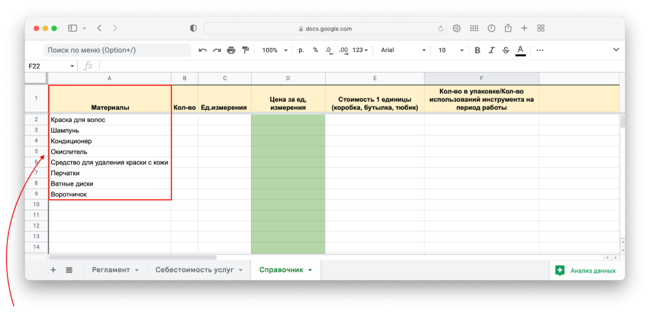 Для расчета сокращенной себестоимости услуги сначала нужно собрать все материалы, которые для нее требуются, в один список. Для окрашивания в один тон список будет таким: