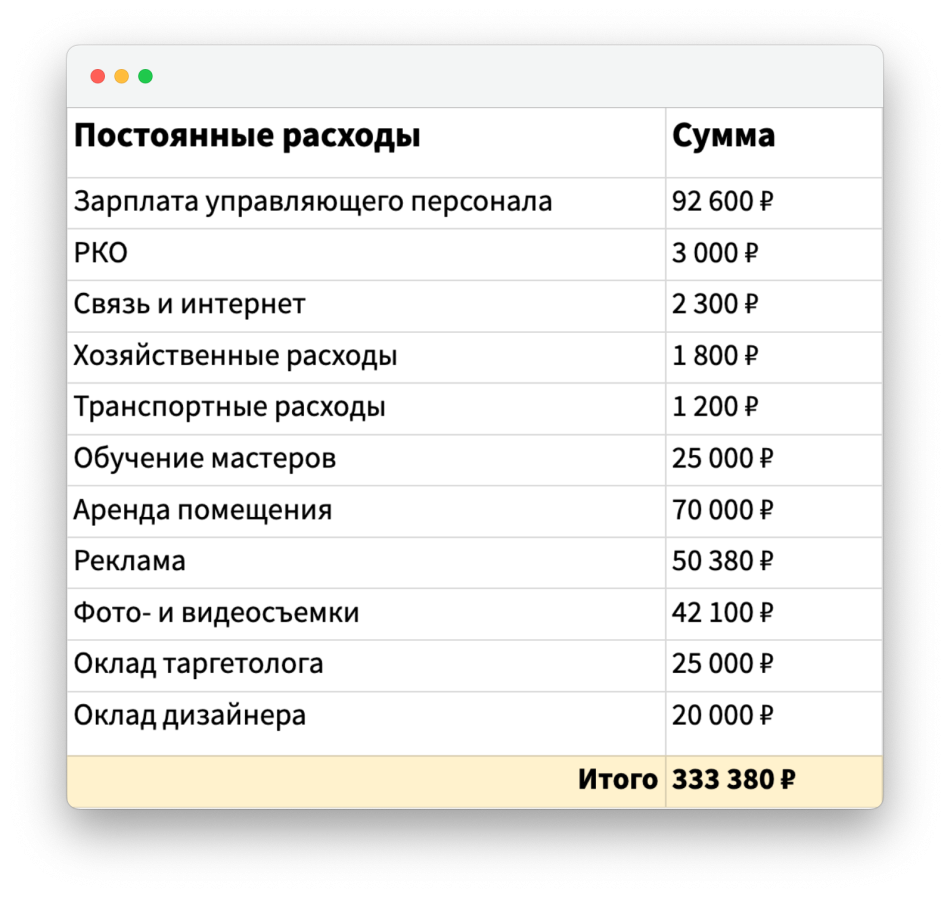 Полная себестоимость учитывает расходы, которые не связаны напрямую с оказанием услуги, — их еще называют постоянными. Например, за воду, электричество и аренду придется платить в любом случае, даже если мастер за месяц не обслужит ни одного клиента.