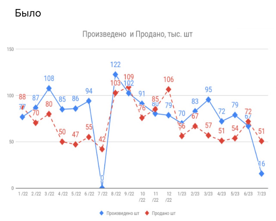 Так выглядело соотношение произведённых и проданных товаров до внедрения единой реальности производства и продаж: