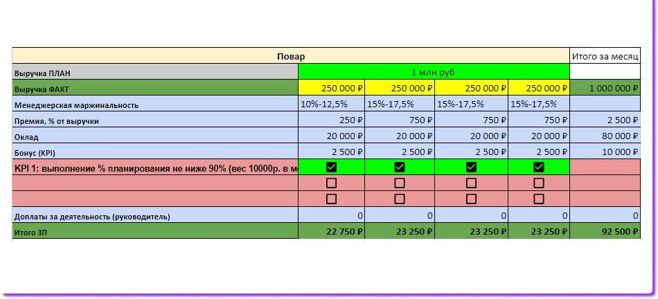 Вот так может выглядеть расчет материальной мотивации для повара с привязкой к выручке