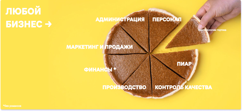 Любой бизнес состоит из семи частей: административного департамента, эйчар-отдела, департамента распространения продукта, финансовой службы, производства, пиара и отдела качества.