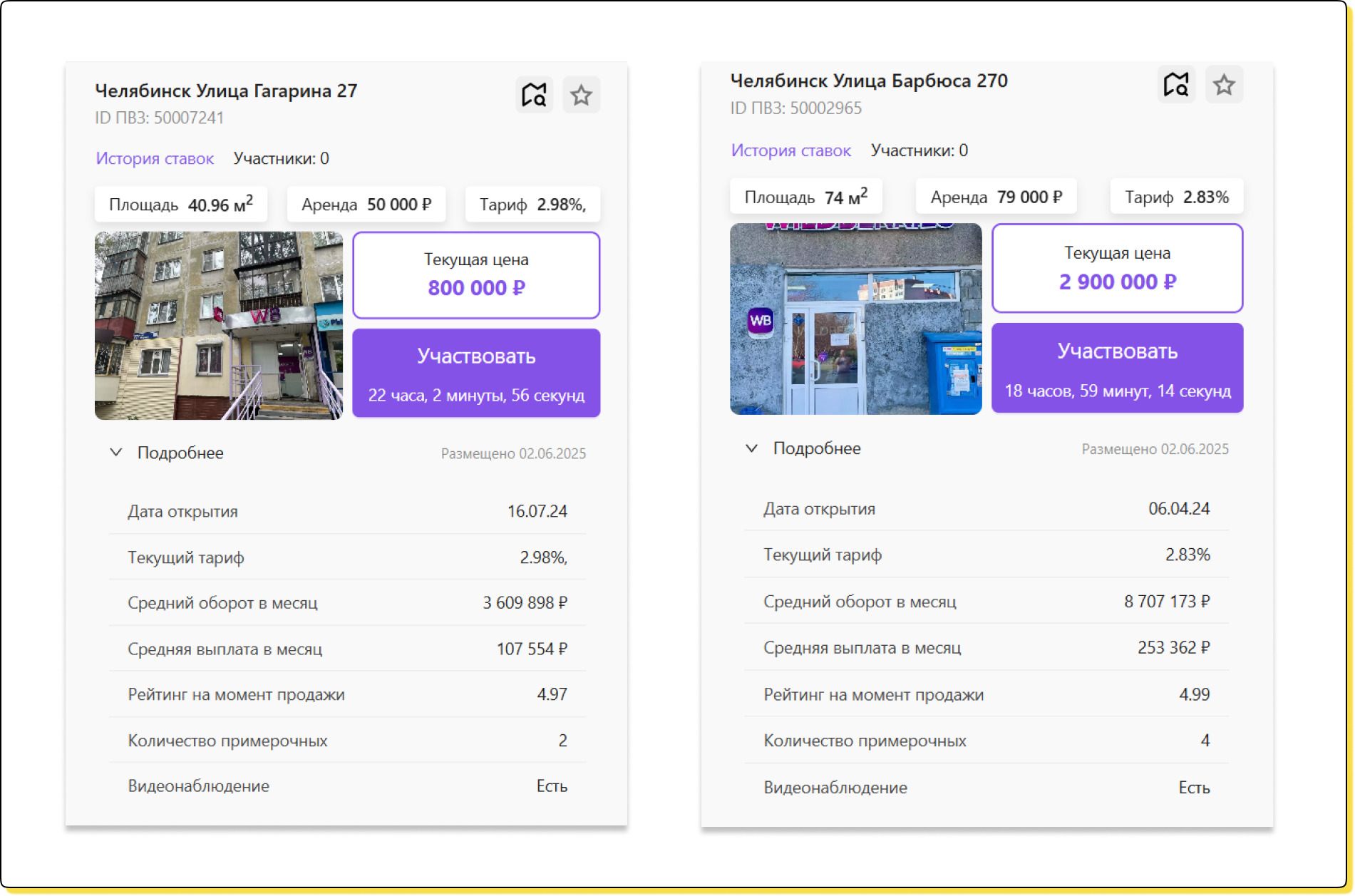 ↑ В лотах на платформе WB Аукцион указаны средний месячный оборот, сумма вознаграждения и стоимость аренды