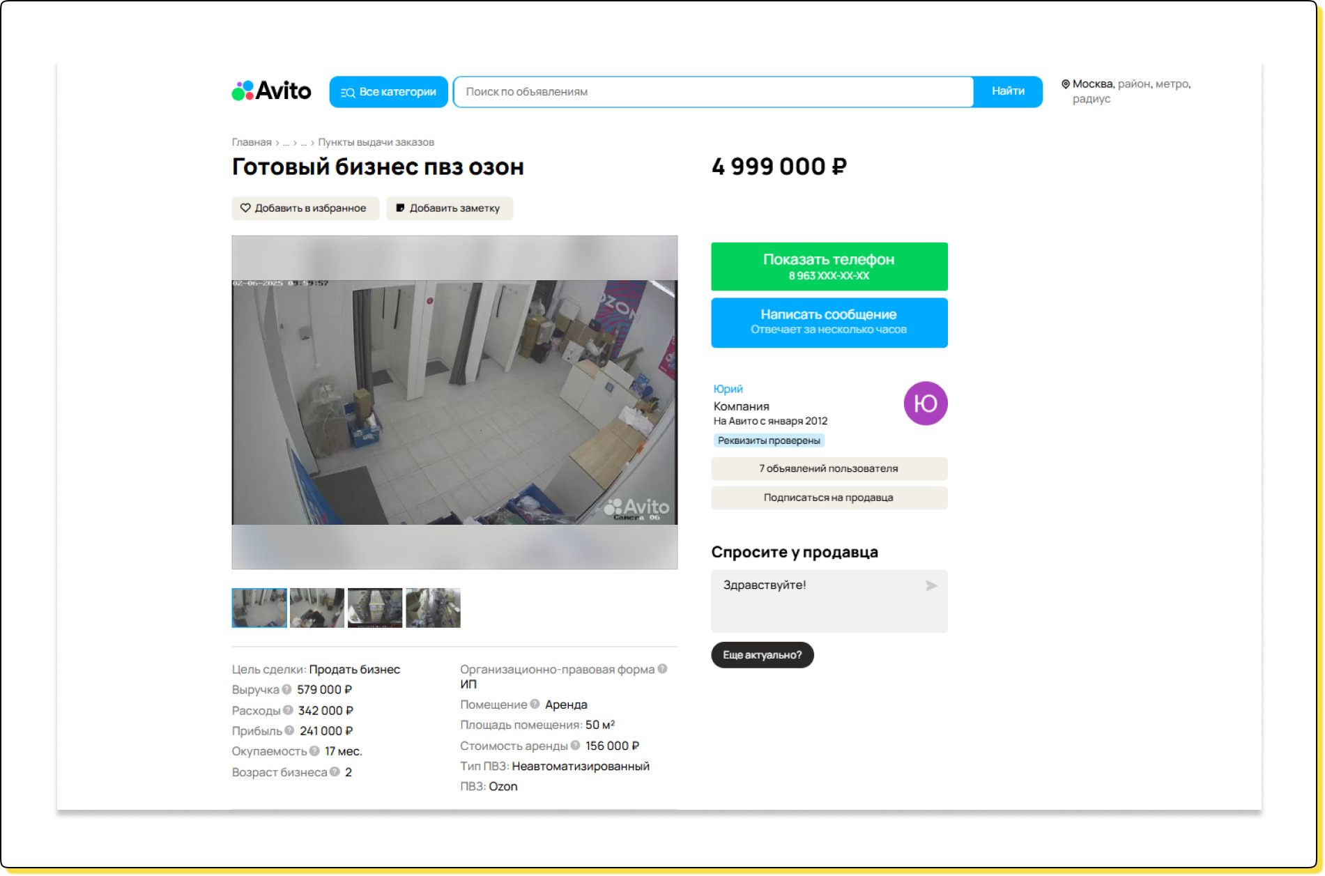 Готовый ПВЗ может стоить по-разному — цена зависит от города, площади помещения и маркетплейса. Искать такие предложения можно на Авито, где встречаются варианты от 300 000 ₽ до нескольких миллионов рублей ↓