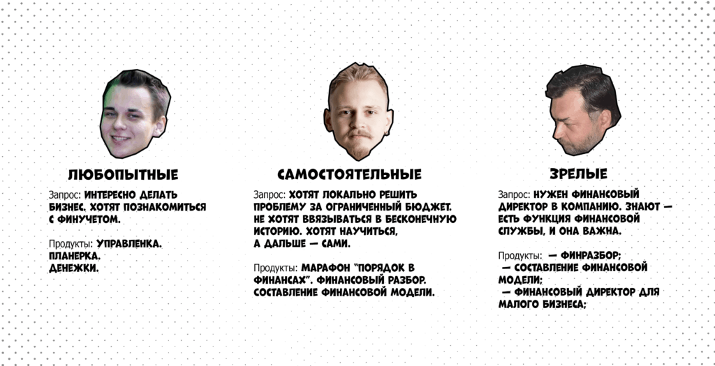 Сегменты есть — теперь надо им предложить то, что им нужно. Важный момент: мы подбираем не клиентов под продукты, а продукты под клиенты.