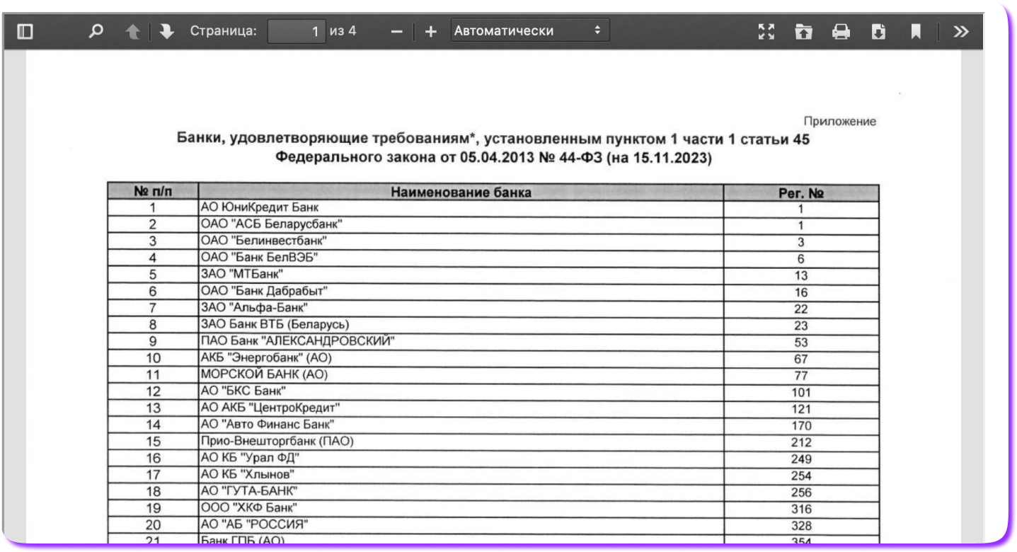 Кусочек перечня банков, подходящих под требования 44-ФЗ, актуален на ноябрь 2023 года