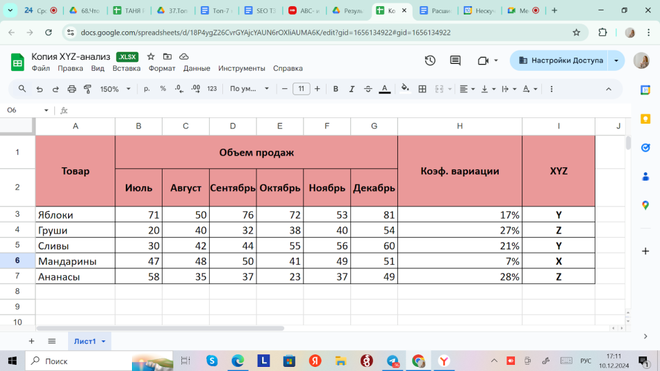 Пример XYZ-анализа за период 6 месяцев