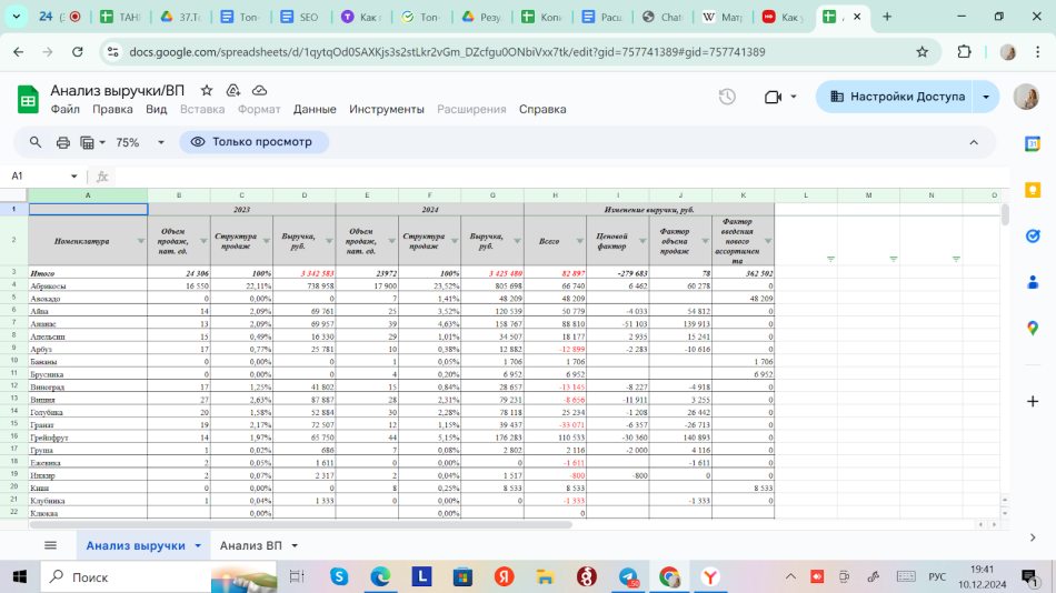 Анализ показывает, как на выручку повлиял фактор расширения ассортимента. В 2024 году в ассортименте компании появилось авокадо, которого раньше не было. Продукт принес в кассу 48 тысяч рублей. Соответственно, на эту сумму увеличилась выручка компании, что помогло нивелировать изменения в выручке от других товаров.