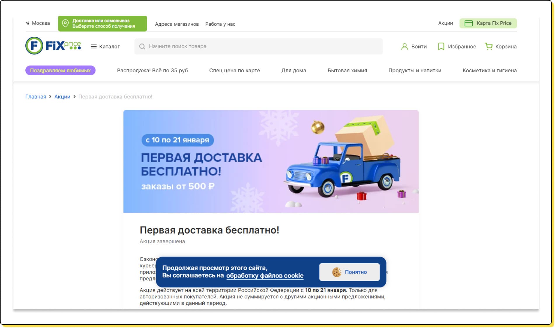 Скидка на первую покупку. В виде промокода, скидки на первый заказ или бесплатной доставки первого заказа.