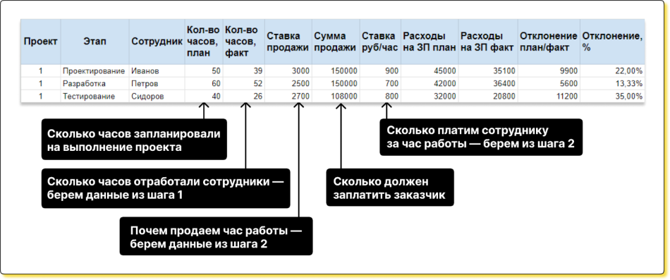 И последний шаг — собрать таблицу с этапами проекта, чтобы посчитать общую сумму расходов по каждому проекту. Так бизнес сможет узнать: