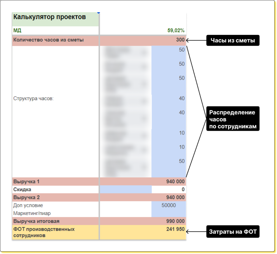 Калькулятор подойдет как тем, кто обсчитывает проекты, так и бизнесу, который продает рабочее время своих сотрудников. Вот как он выглядит ↓