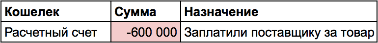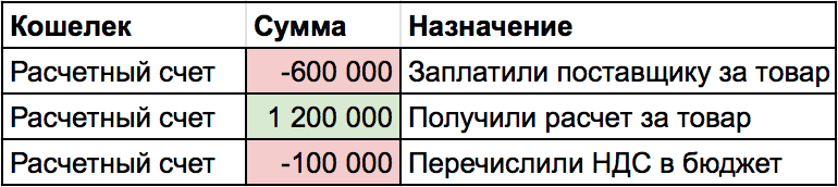 Витя купил партию компьютеров за 600 тысяч ₽. Из них 500 тысяч заплатил за сами компьютеры, а 100 тысяч — НДС, который поставщик добавил к цене. Но нам это пока не важно, мы так и пишем в ДДС: -600 000 ₽ — заплатили поставщику за товар».