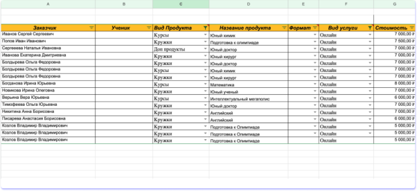 Учет сделок — показывает доходы и расходы по каждому клиенту. В этом отчете видно, сколько школа тратит на каждый конкретный продукт и сколько зарабатывает с него. Вот он: