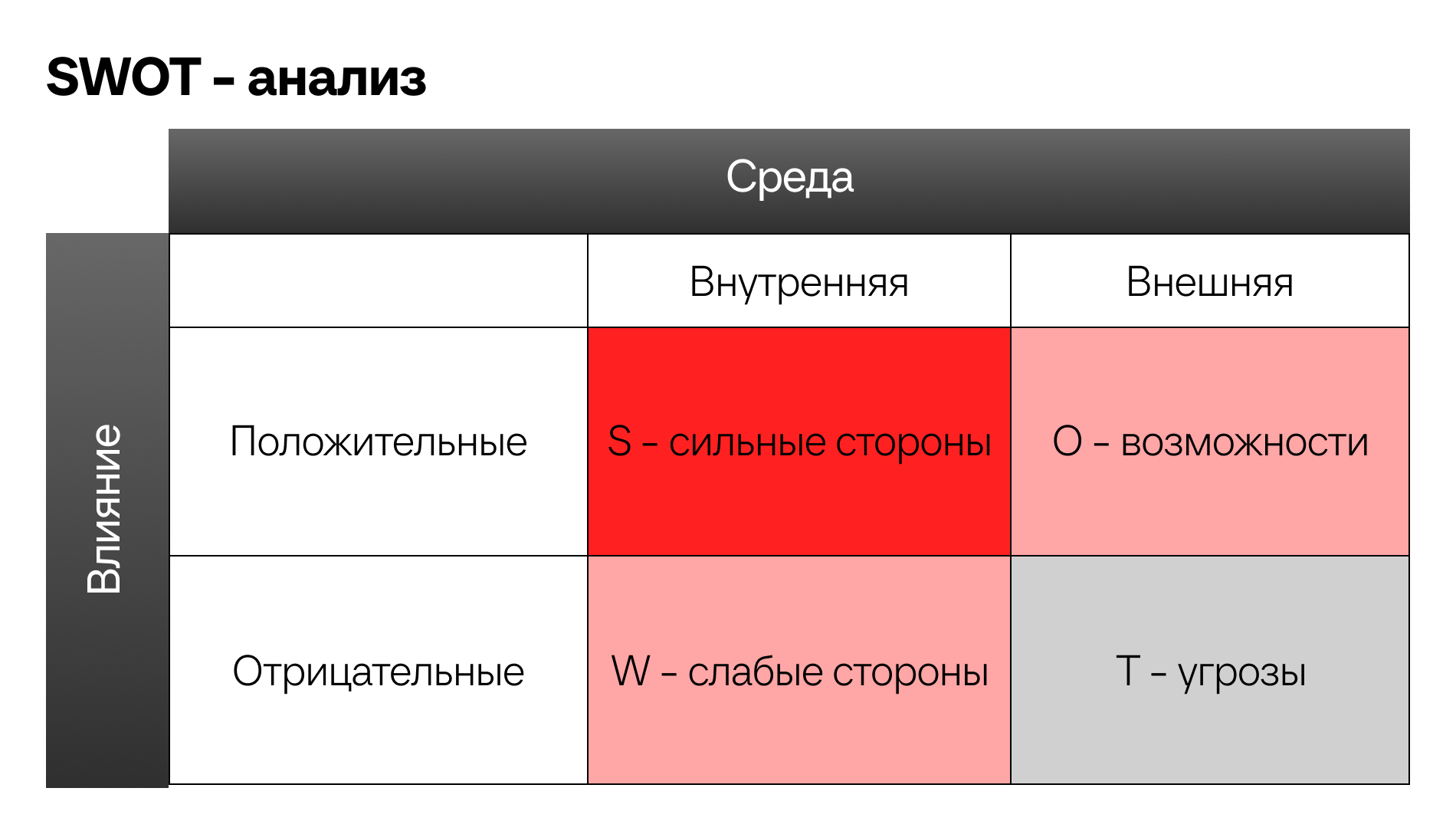 3. Помогает действовать: зная эти риски, собственник оперативно создает сайт (укрепляет слабость) и запускает программу лояльности (борется с угрозой), чтобы снизить их влияние.