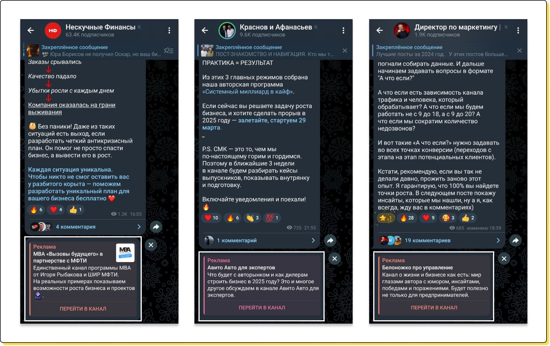 Инструмент продвижения, который позволяет запускать рекламу прямо в мессенджере. Последний из таких инструментов, доступный в России, — Telegram Ads. Платформа дает возможность запустить таргетированную рекламу в публичных каналах с аудиторией от 1000 подписчиков. Например, вот так ↓