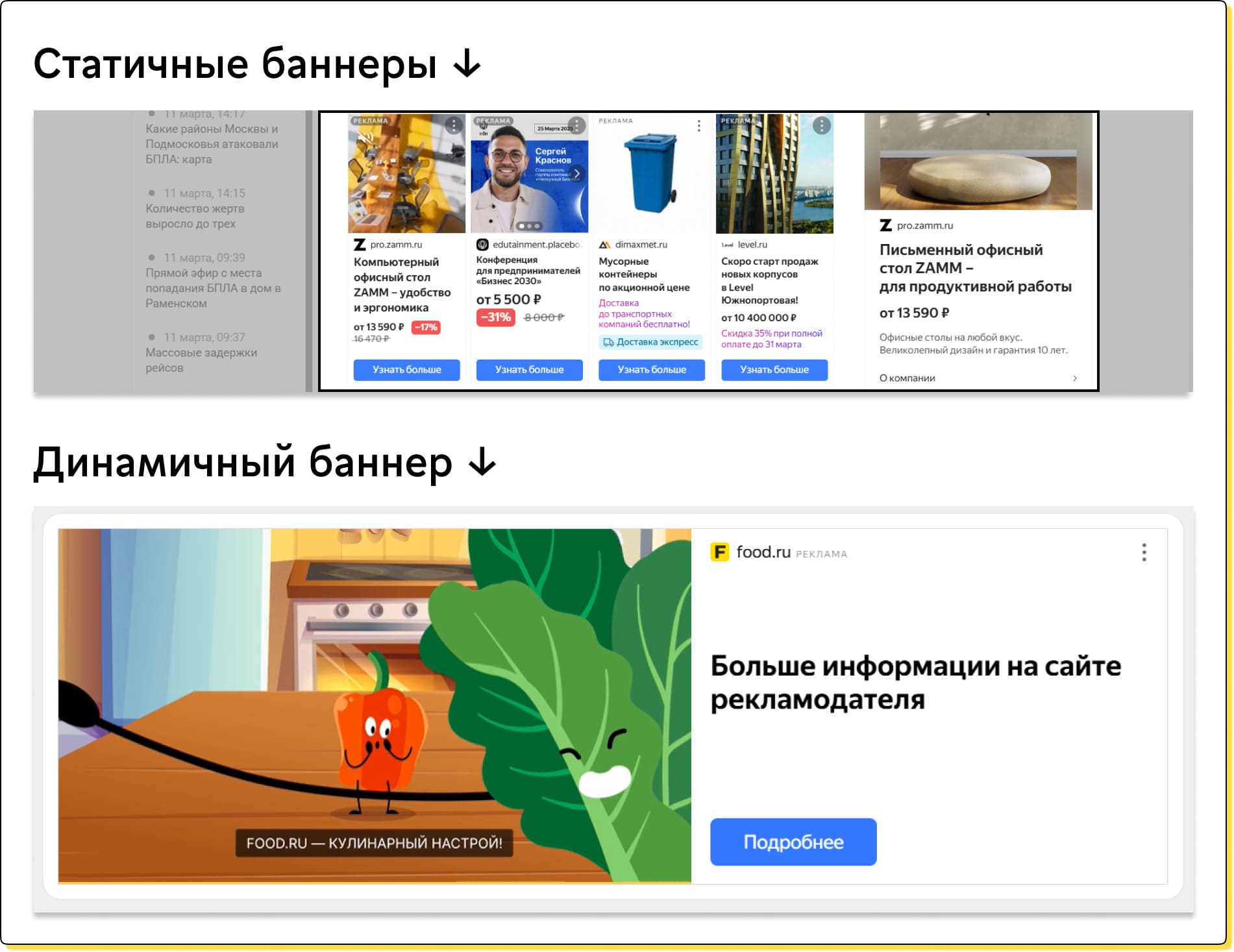 ↑ Статичные баннеры с рекламой компьютерного стула, конференции для предпринимателей, контейнера и апартаментов от застройщика, а также динамичный баннер — реклама сайта рецептов в виде мультфильма с овощами