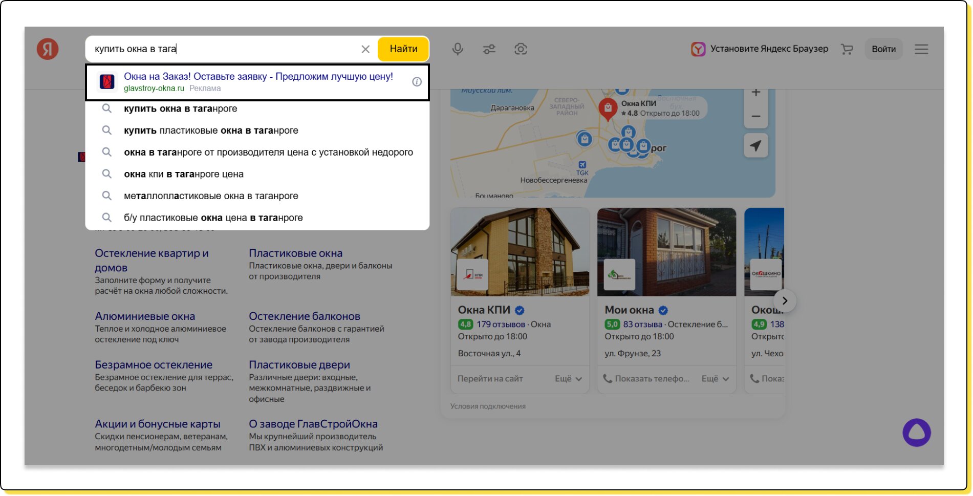 ↑ Контекстная реклама пластиковых окон, встроенная в поисковую выдачу пользователя