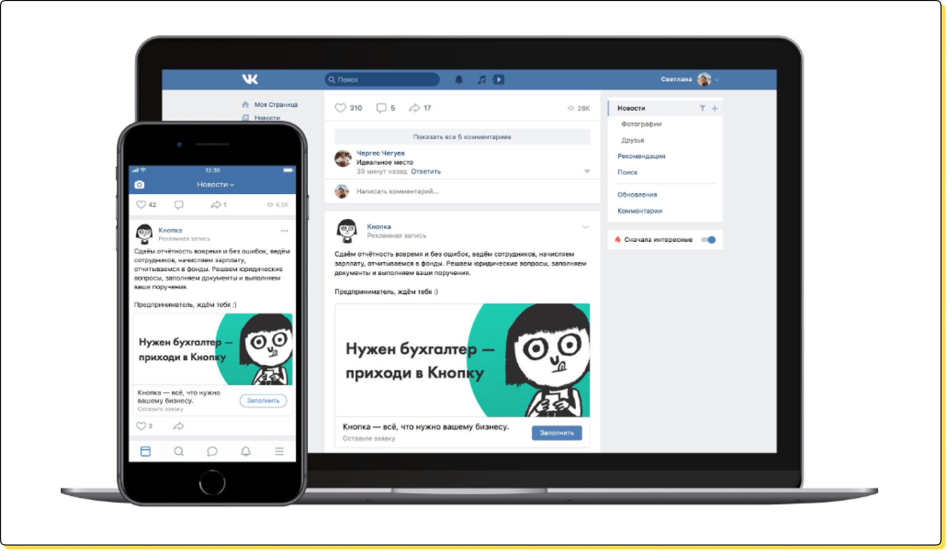 ↑ Таргетированную рекламу в социальной сети ВКонтакте можно запустить на нужную аудиторию как в ленте приложения VK, так и на версии для ПК