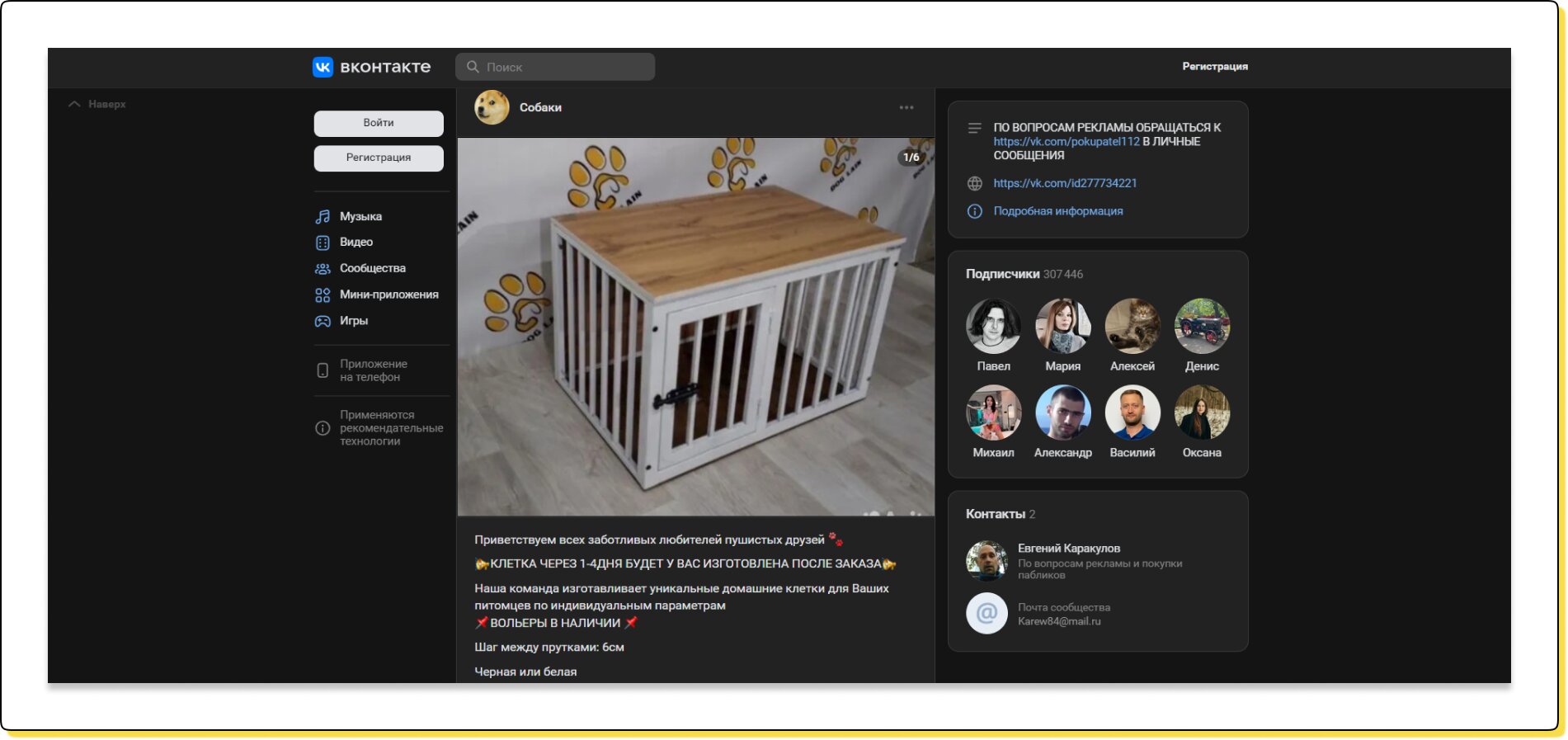 ↑ Пример рекламы в группе любителей собак, которую можно заказать как через биржу, так и напрямую у администратора сообщества
