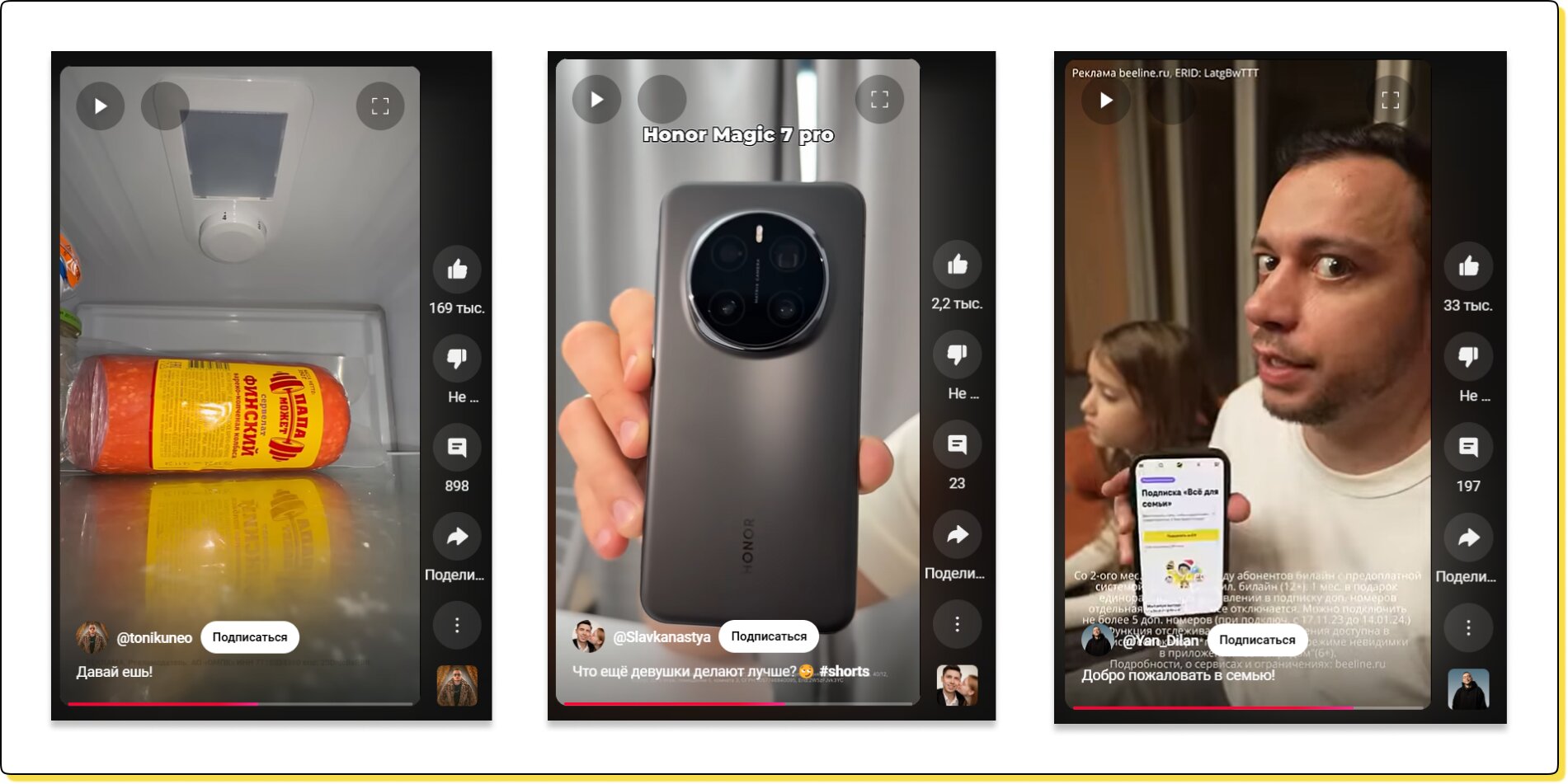 ↑ Реклама колбасы, телефона и мобильного оператора, через которую бренды пытаются заинтересовать аудиторию блогеров в YouTube Shorts