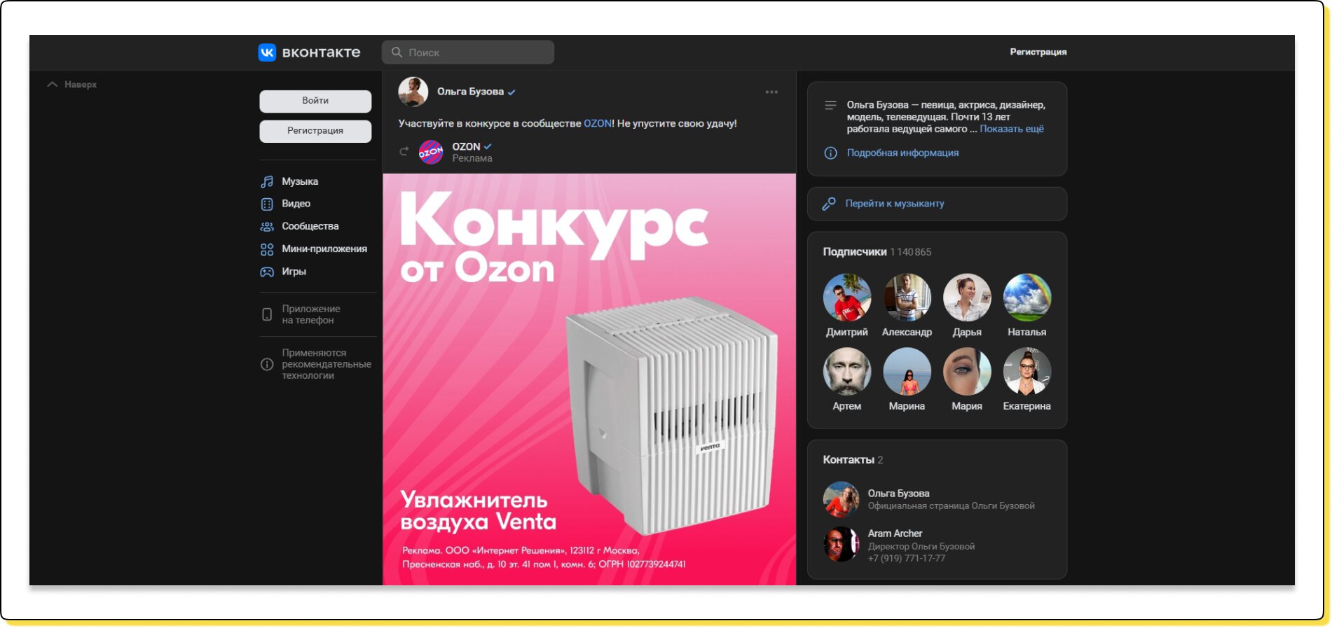 ↑ Реклама конкурса маркетплейса Ozon на странице певицы Ольги Бузовой в ВКонтакте