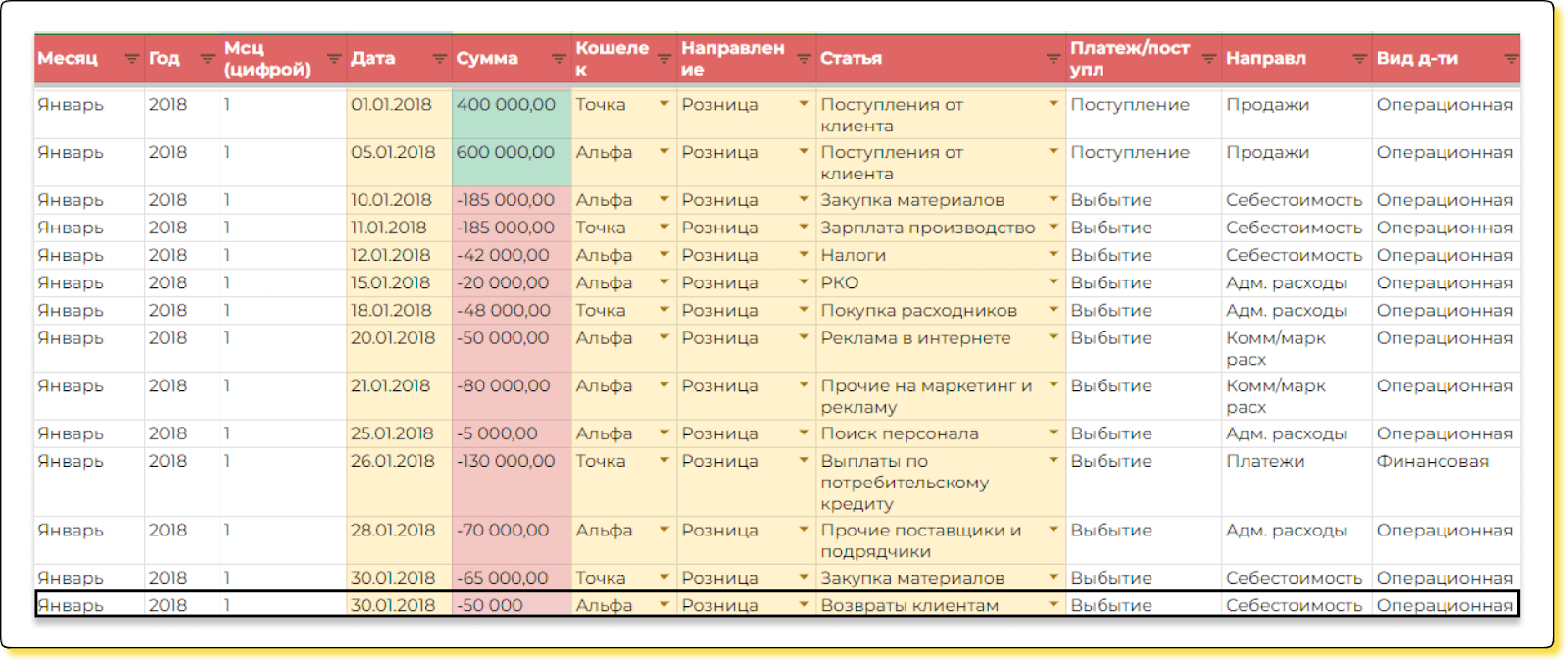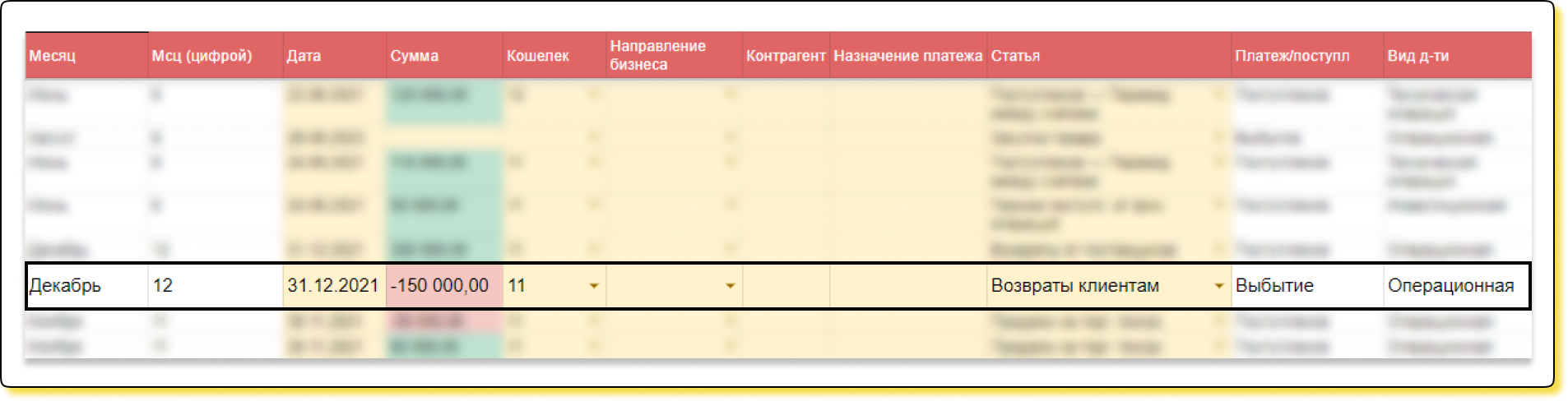 Все возвраты заносят в отчет о движении денежных средств, или ДДС, который выглядит так ↓